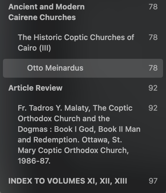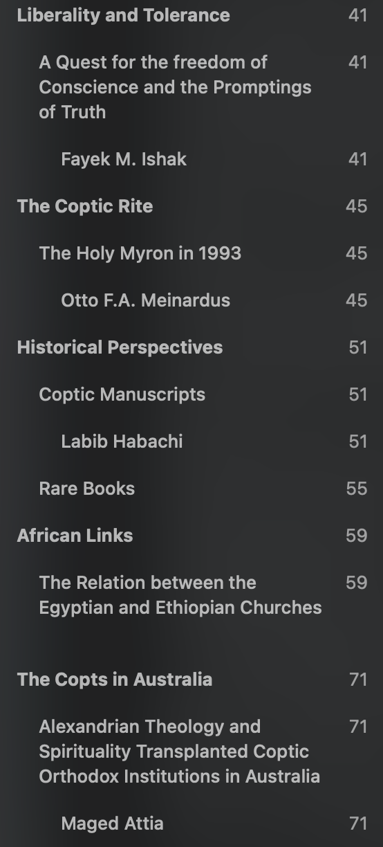 Contains studies on the Holy Myron, rare books, the copts in Australia, and the historic Cairene churches.