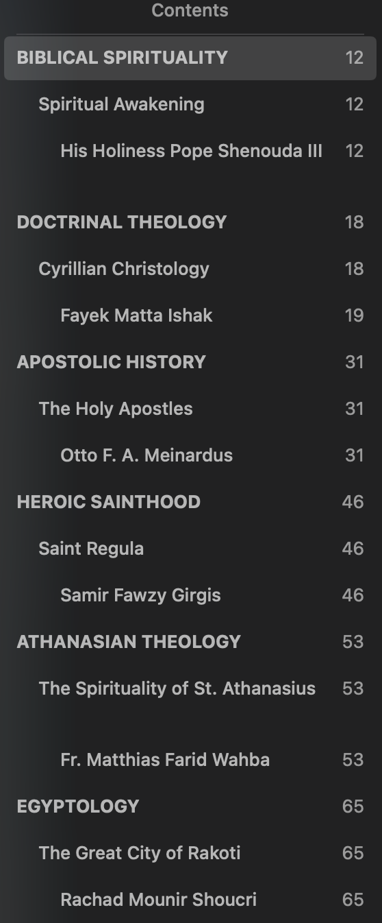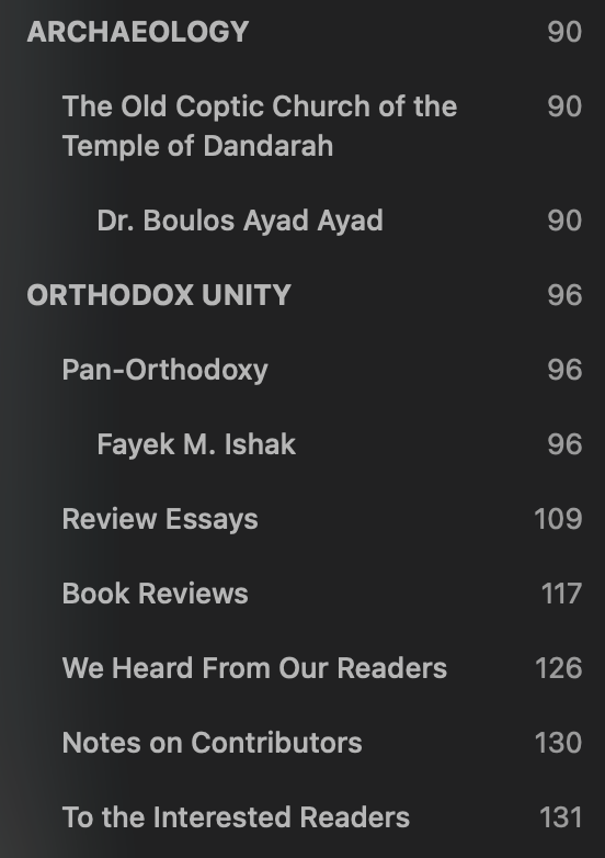 Features such important studies as Spiritual Awakening; by His Holiness Pope Shenouda III, Christology of St. Cyril, Pillar of Faith, The Holy Apostles, Saint Regula, The Spirituality of St. Athanasius, The Great City of Rakoti, The Old Coptic Church of the Temple of Dandarah, Pan-Orthodoxy; or Orthodox Unity in addition to Review Essays and Book Reviews of major works.